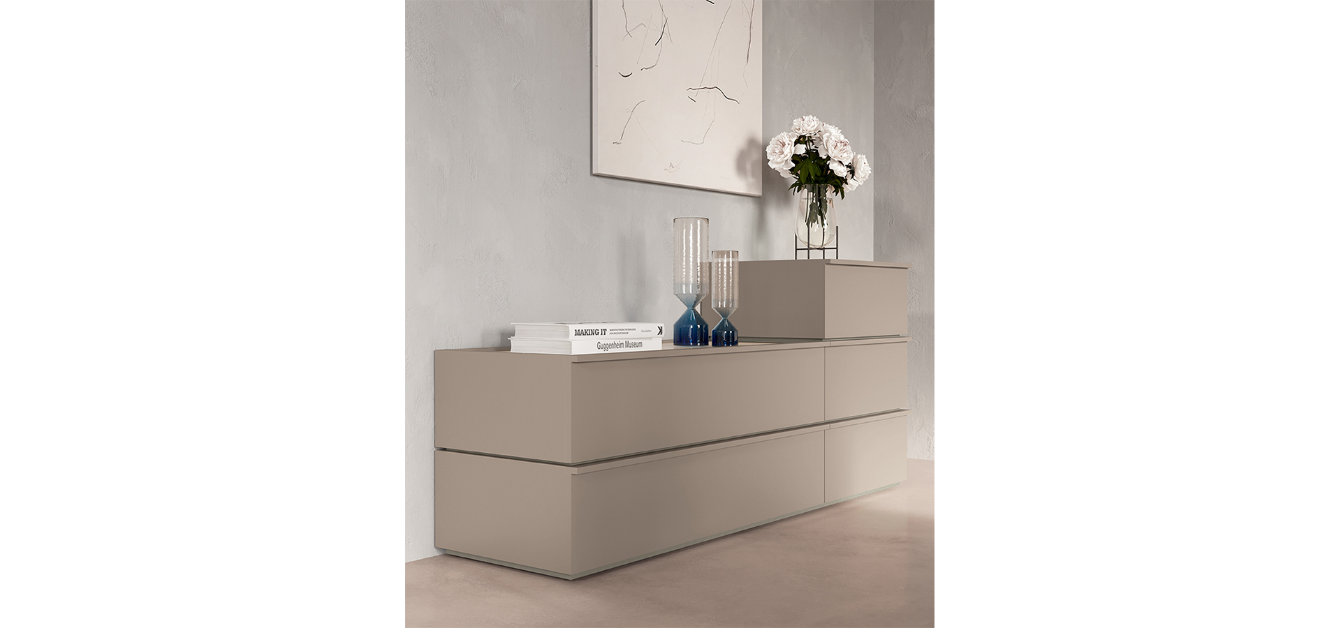 Il gruppo notte Gae è nato dall’idea di componibilità dei moduli per lo sviluppo di innumerevoli configurazioni. La sua elevata modularità lo rende il complemento perfetto per qualsiasi necessità di spazio e stile. Caratterizzato da maniglie in legno integrate in armonia cromatica con i frontali, offre moduli retrofiniti e sovrapponibili, che consentono di giocare con le tonalità, scegliendo tra top in tinta o a contrasto. La possibilità di sperimentare con materiali di pregio come il top in gres amplifica ulteriormente la sua capacità di inserirsi con naturalezza e raffinatezza in ogni contesto abitativo.